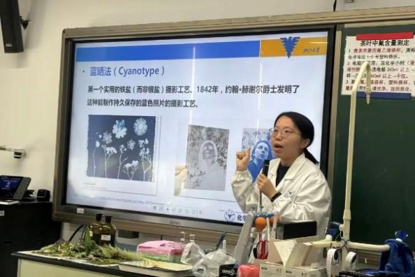 在浙江大学化学实验中心星火馆,同学们体验了独具特色的科普实验课程。活动开始,指导教师蓝国纯老师讲授了实验操作规范和安全注意事项,陈晨老师深入介绍了蓝晒法——这一19世纪首个实用型铁盐摄影工艺的发展历程。通过生动的讲解,学生们了解到蓝晒实验的反应原理。