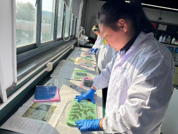 随后,在动手环节中,同学们穿上白大褂、戴上手套,在老师的指导下开始了实验探索。从调配感光液到均匀涂刷滤纸,再到选择心仪的画片与植物原料进行固定,每一步都表现出极大的专注和投入。在光照、冲洗、晾晒等步骤完成后,当阳光催化显色剂发生奇妙反应,空白纸张上逐渐呈现出蓝白分明的图案时,现场爆发出一阵阵惊喜的欢呼。同学们兴奋地展示自己的"独家创作",并合影留念。在老师的指导下,他们还利用蓝晒技术制作了独一无二的蓝晒版集体照。
